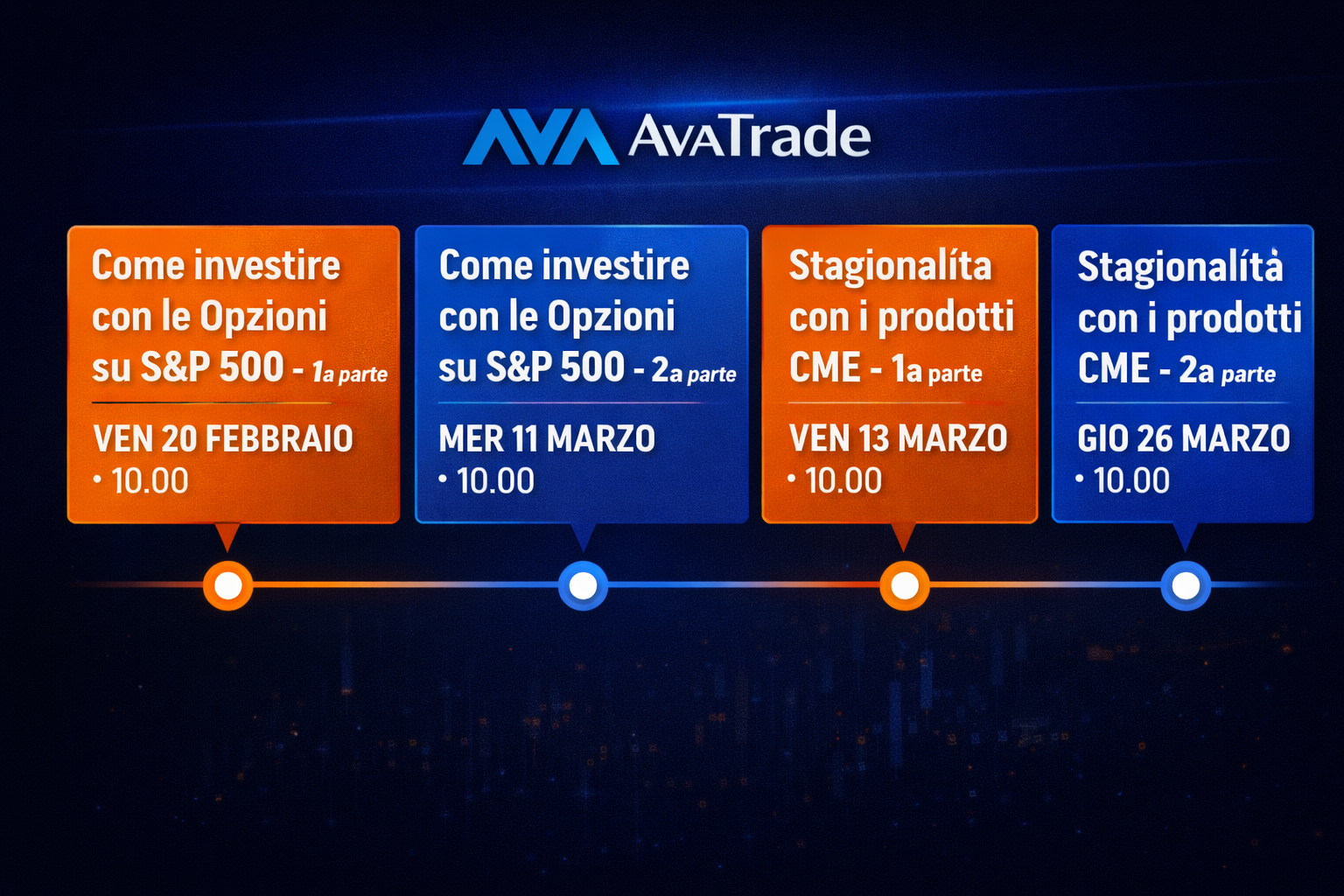 Quattro webinar gratuiti realizzati in collaborazione con AvaTrade, dedicati a chi vuole approfondire l’uso delle Opzioni su S&P 500 e la stagionalità sui prodotti CME.